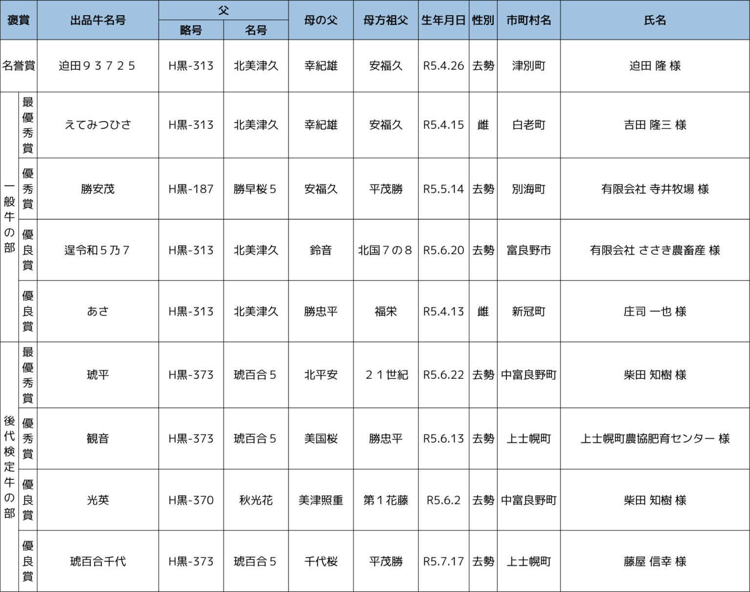 計101頭の出品の中から、名誉賞には津別町の迫田 隆 様の「H黒-313 北美津久」の去勢産子が選ばれました。